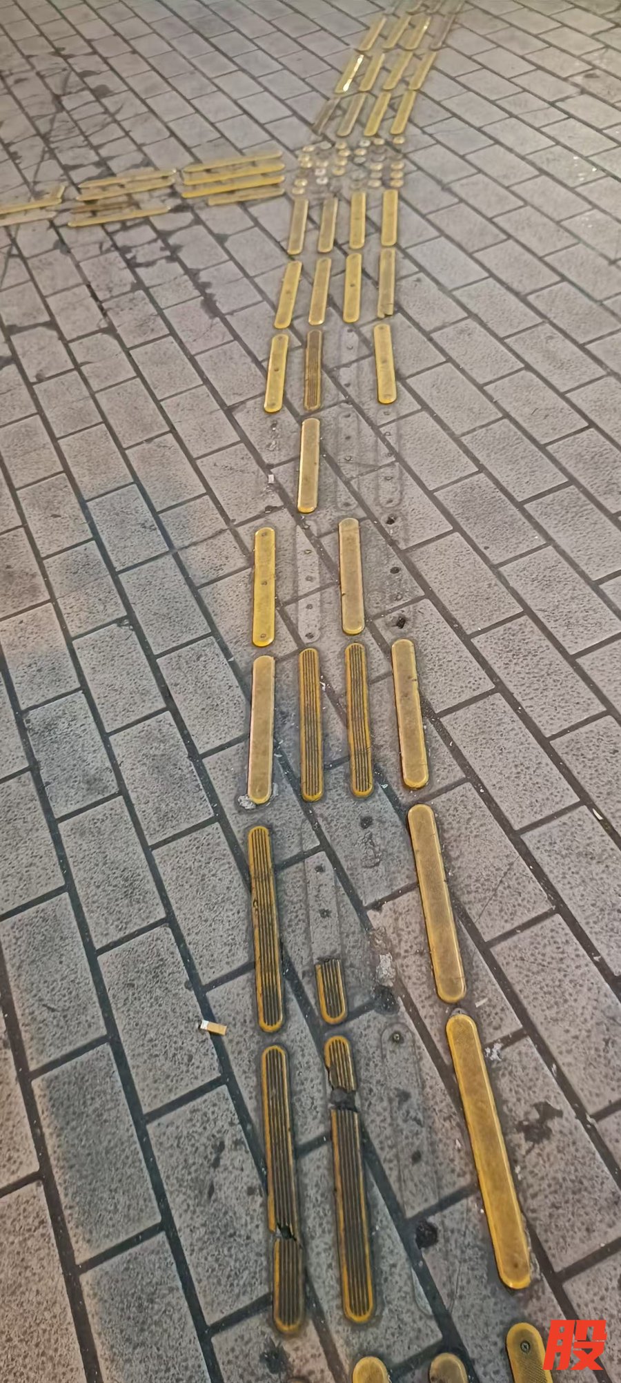 昨晚7时许,记者实地走访后发现,从淮海中路向南至兴安路的20多米盲道上,近20块地砖的盲道条缺失,原本连贯的黄色指引带变得断断续续。一位路过的环卫工人透露,这种情况已经存在一段时间,“偶尔能看到有人来补,但没过多久又会缺几块。”